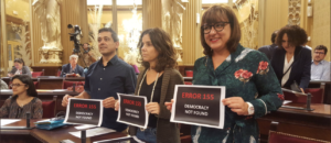 Els grups parlamentaris de Més exhibeixen cartells amb el missatge 'Error 155'