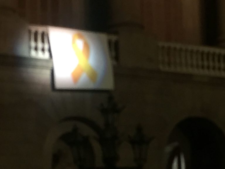 Un focus de llum des de la Generalitat il·lumina el llaç groc de l'Ajuntament de Barcelona referèndum 1-O