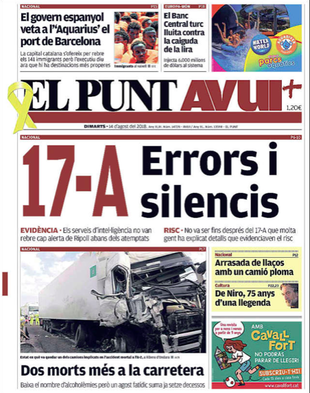 Les portades dels diaris: '17-A, errors i silencis' i 'Sánchez evita ara acollir l'Aquarius'