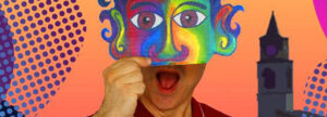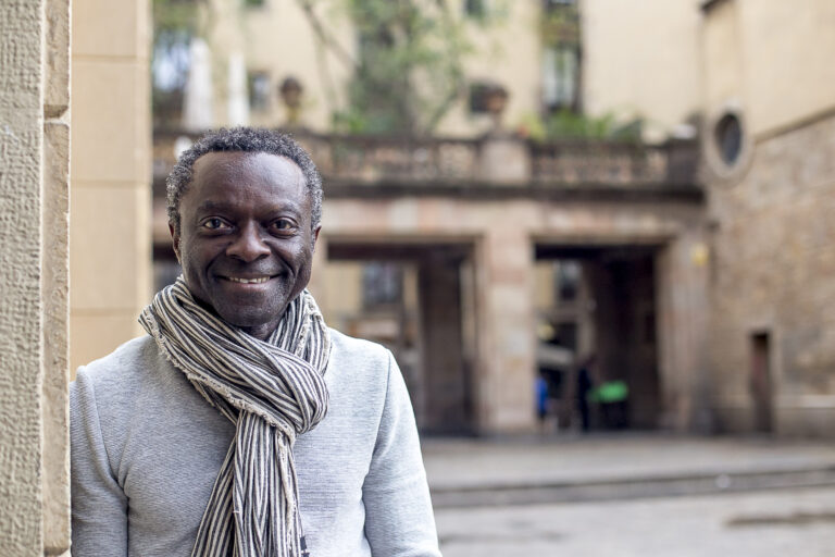 Imaginació moral: davant d’una pancarta grandiosa del barri a sobre d’un mural hiperartístic del museu del costat, al Raval